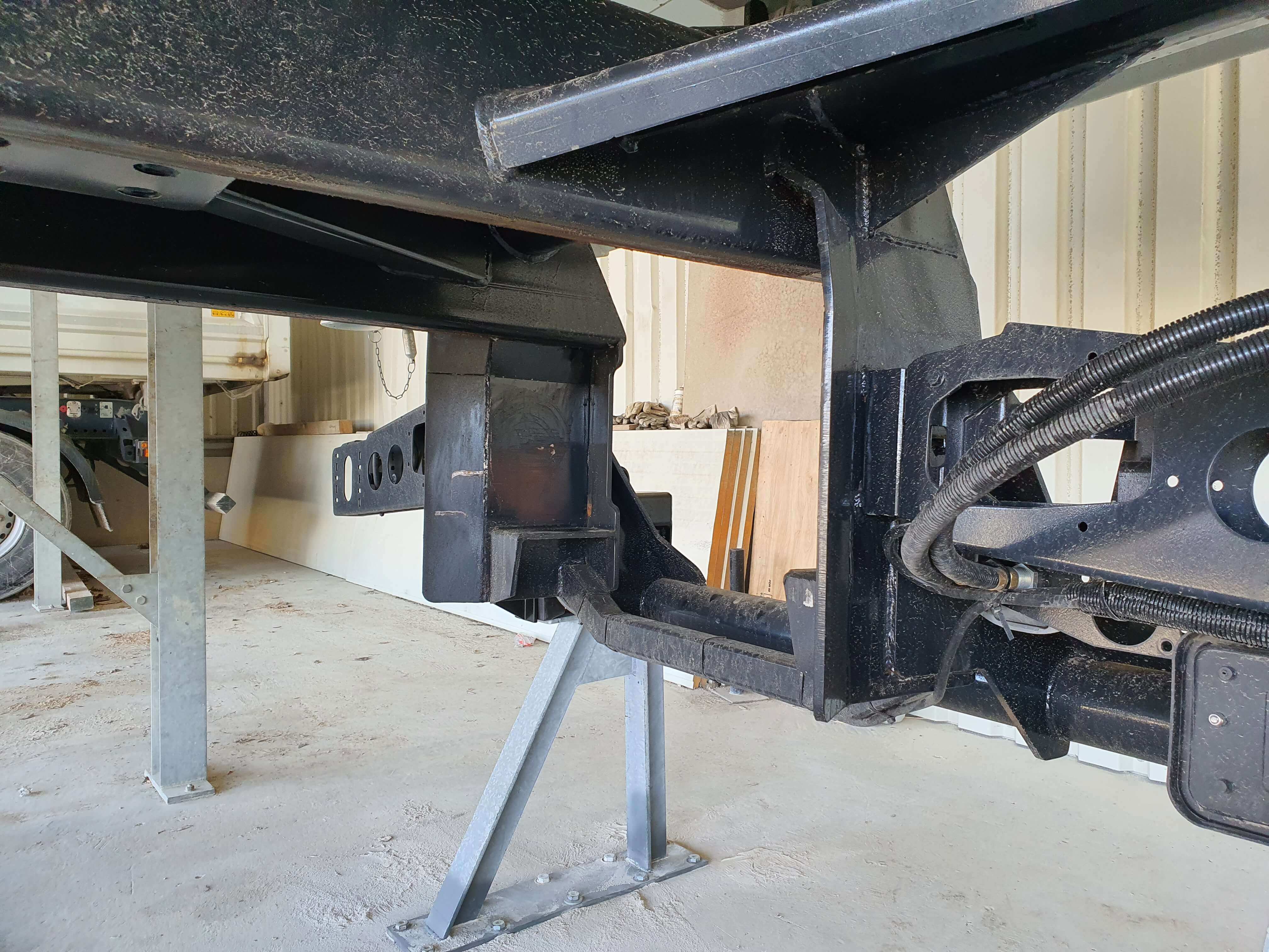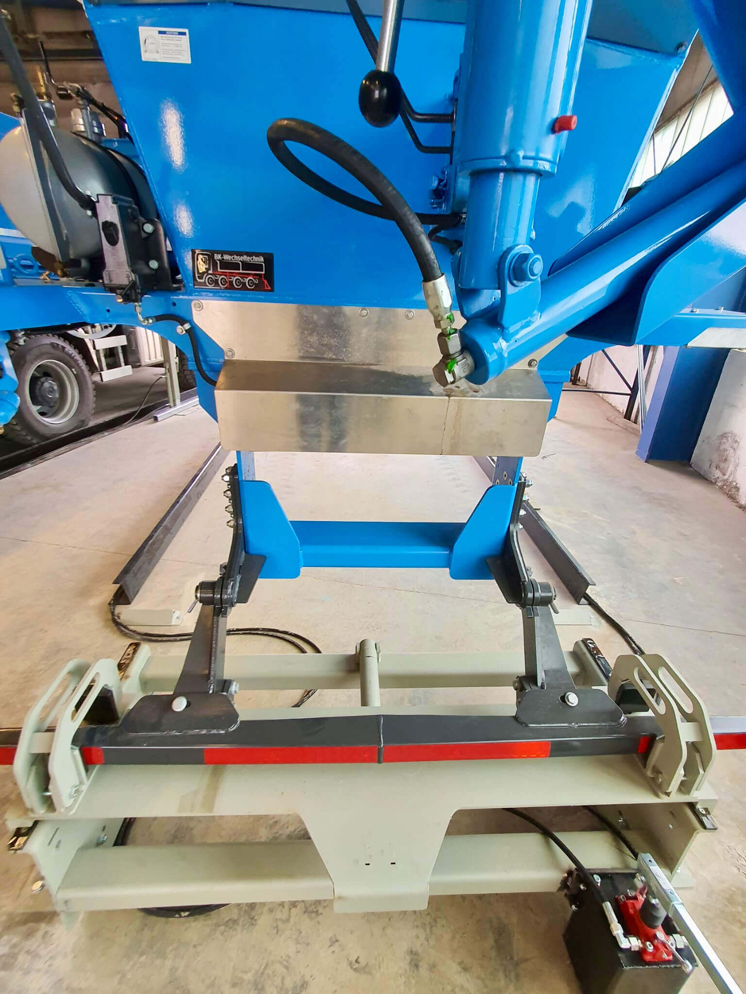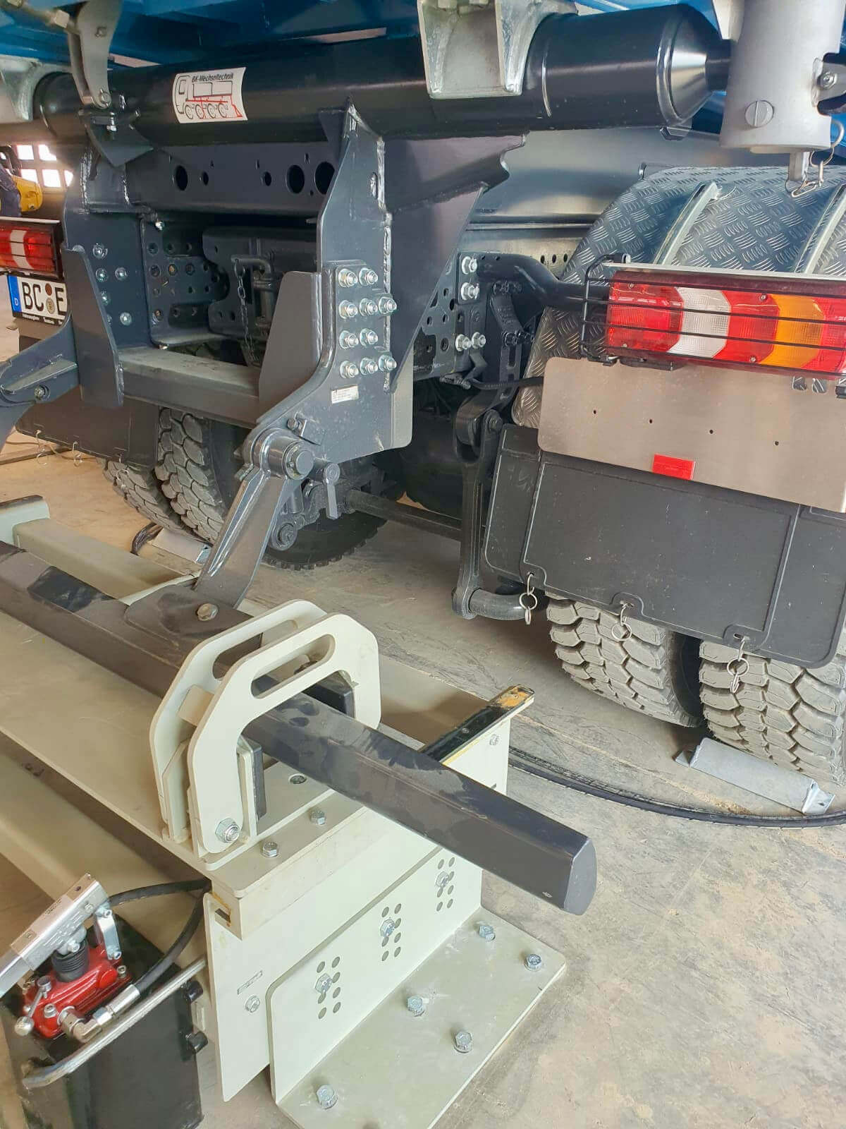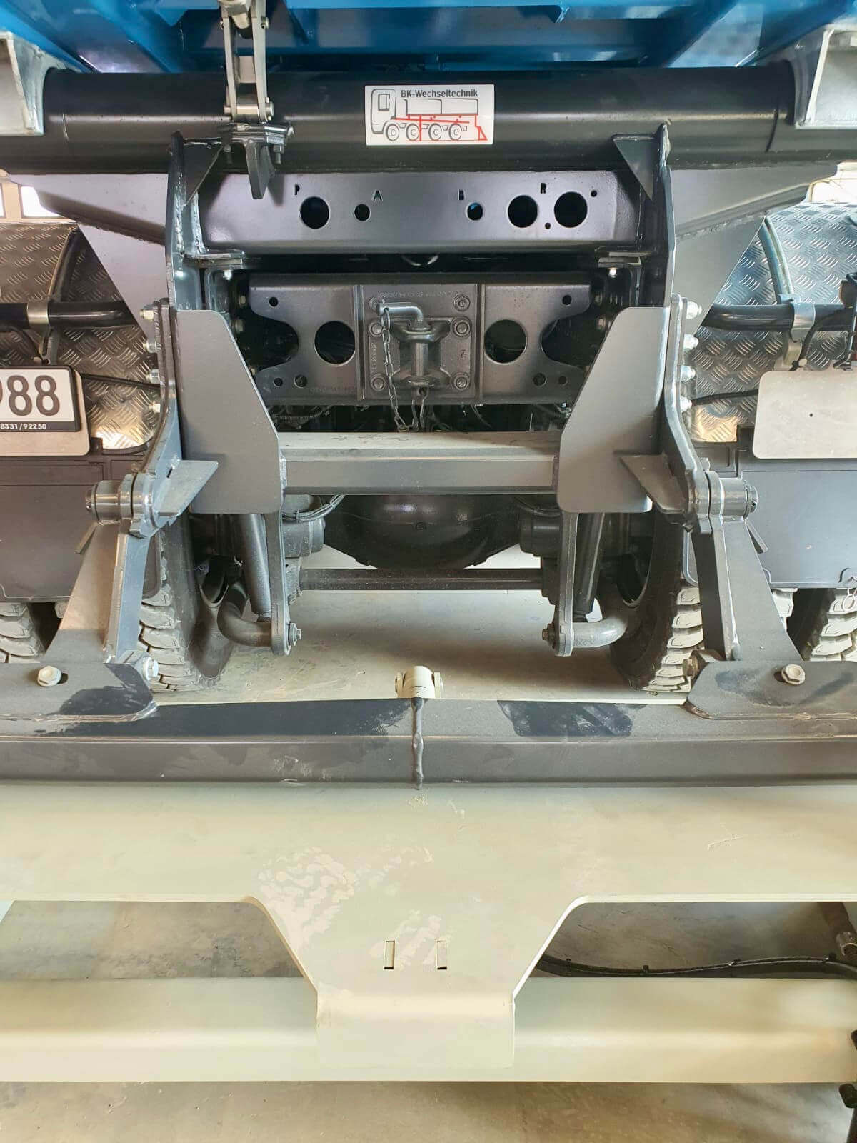 - Die verschiebbaren Hydraulik Einfahrböcke ziehen den Aufbau aus den Verriegelungskrallen