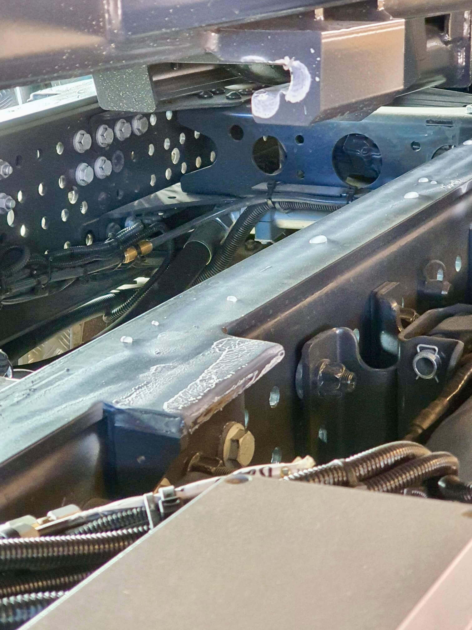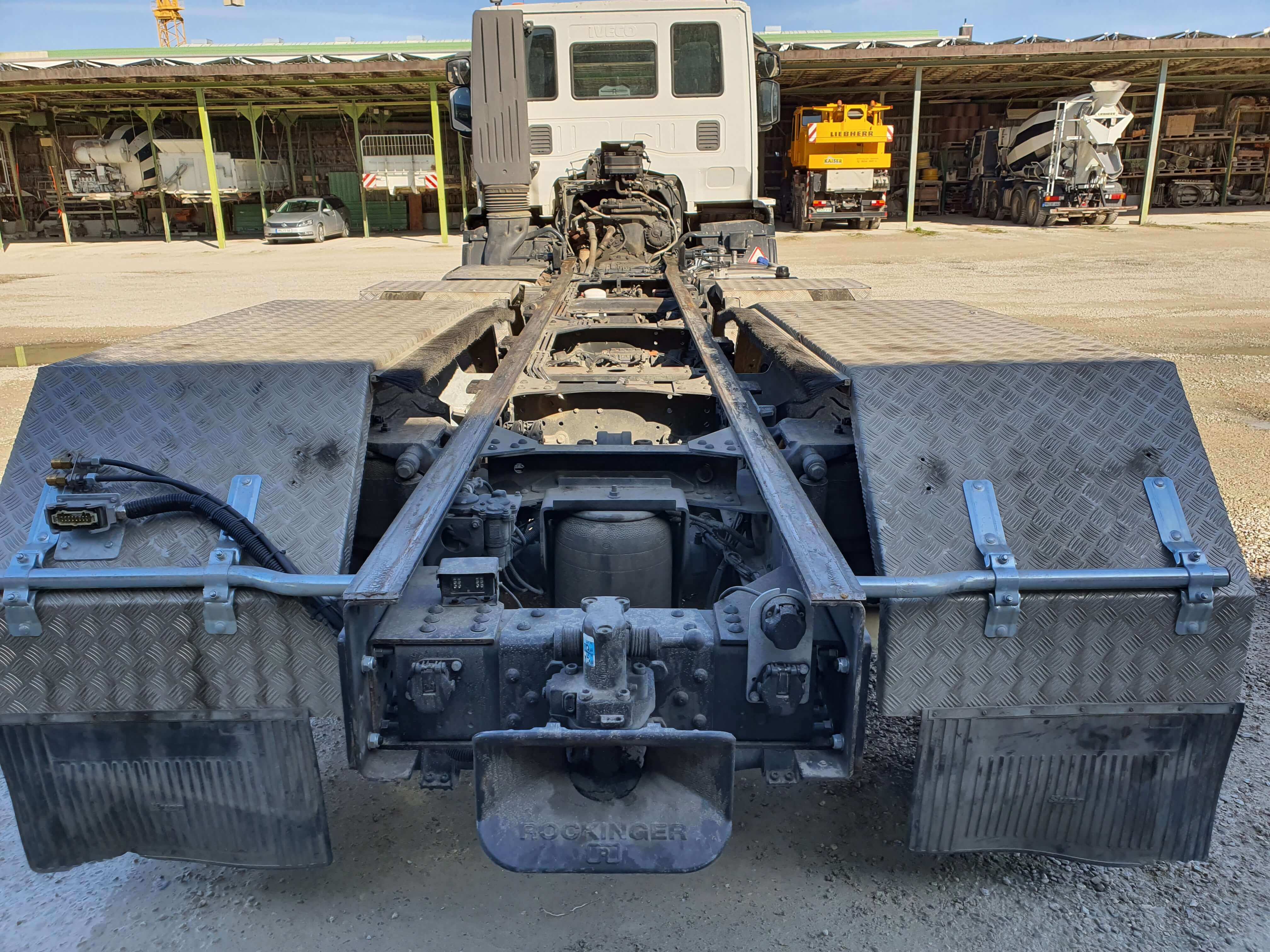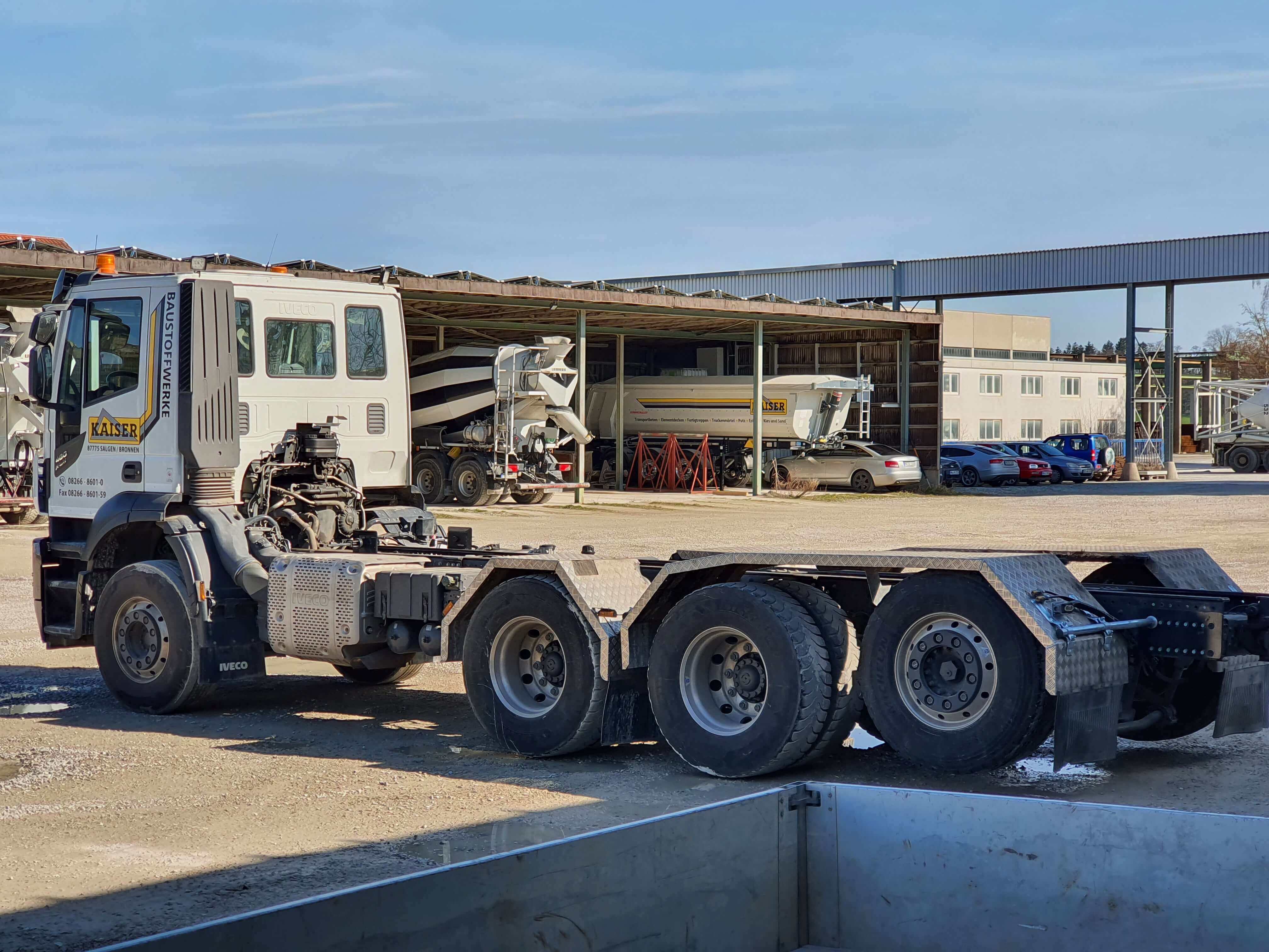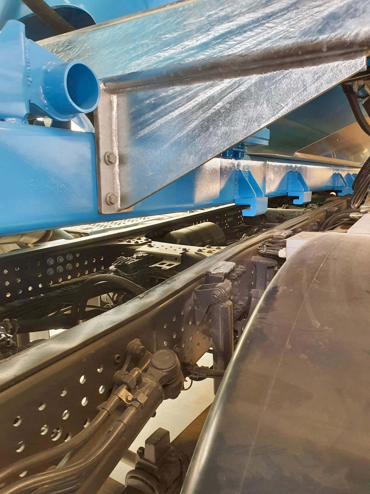 - Die verschiebbaren Hydraulik Einfahrböcke ziehen den Aufbau aus den Verriegelungskrallen